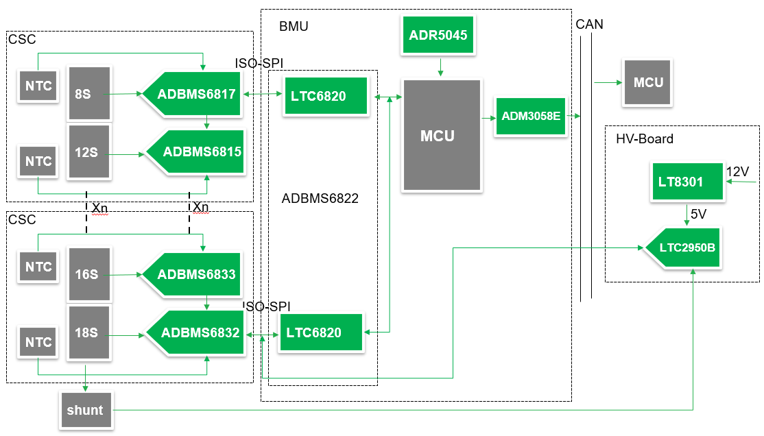 ADI的電池解決方案能夠提供全溫度范圍內(nèi)的高精度、高可靠性,并且支持ASIL-D的安全等級(jí),在多變的電池包結(jié)構(gòu)中提供完整的電池通道選擇,可以做到模組化的任意組合和連接。通過菊花鏈的連接方式使整個(gè)系統(tǒng)的線束連接更簡潔,更優(yōu)化。