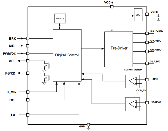 18V、3A三相無刷無感驅(qū)動、180˚正弦,集成驅(qū)動算法+預(yù)驅(qū)+MOS |