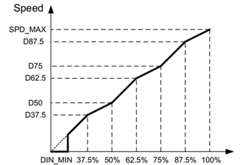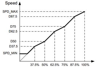 PWM/DC引腳控制電機速度,可配置寄存器CFR_3選擇。SPD_MAX寄存器配置輸入脈寬調(diào)制占空比為100%時的速度。另外,MPQ6632提供五點曲線配置功能,當輸入占空比為37.5%、50%、62.5%、75%或87.5%時,可以配置輸出速度。線性插值發(fā)生在相鄰占空比之間。