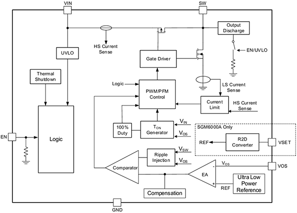SGM6000 1.75V 至 5.5V 輸入,靜態(tài)電流 300nA,輸出電流 700mA 的同步降壓轉(zhuǎn)換器