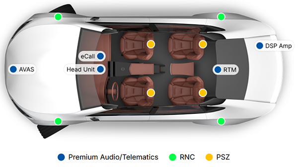 借助A2B 2.0的能力升級,汽車制造商可在設(shè)計中集成更具沉浸感的音頻技術(shù),包括AVAS(車輛聲學(xué)警示系統(tǒng))、RNC(路噪降噪)、PSZ(個人音區(qū))和車外語音功能。