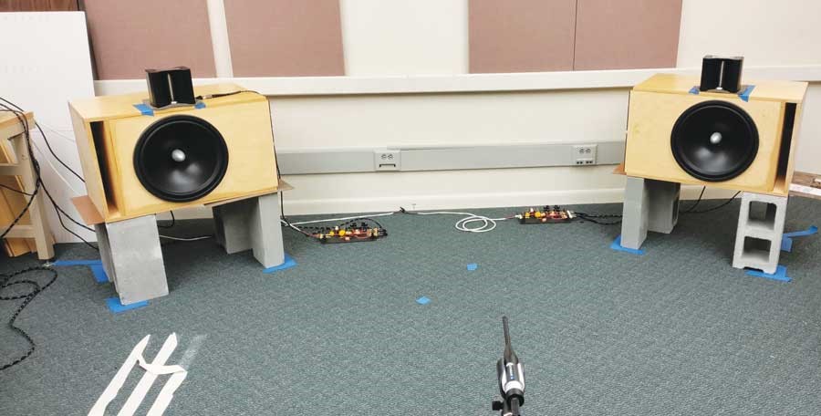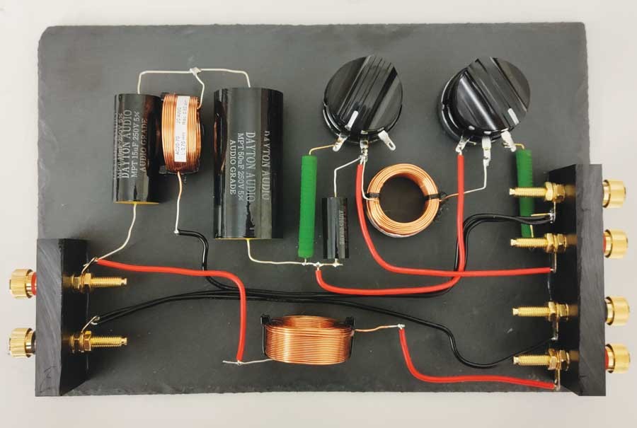 測試設(shè)置(圖2)使用Acoustic Elegance TD15H-4s作為低音揚(yáng)聲器,并搭配以線性響應(yīng)、低分頻點(diǎn)和寬擴(kuò)散特性著稱的ESS Heil Air Motion Transformer™中高頻器件。這些揚(yáng)聲器與高性能無源分頻器(圖3)相結(jié)合,并由Behringer NX1000放大器供電,該放大器在4 Ω時的每通道輸出功率可達(dá)300 W,THD為0.05%。