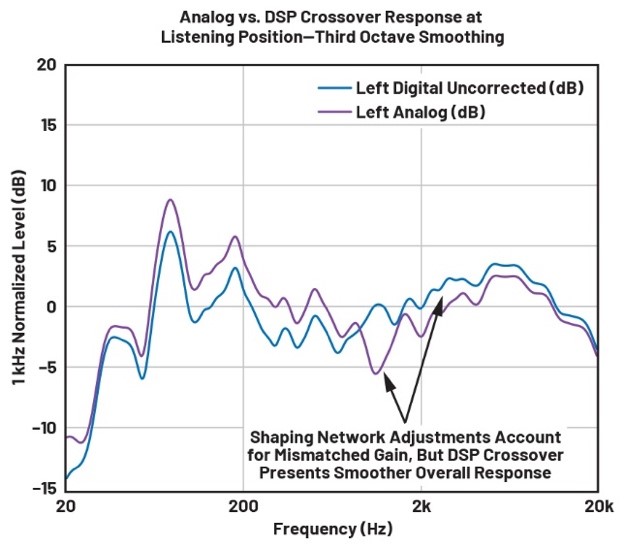 圖5.模擬和數(shù)字系統(tǒng)分頻器網(wǎng)絡(luò)的響應(yīng)。請注意,數(shù)字左右通道都存在,但在圖中完全重疊。