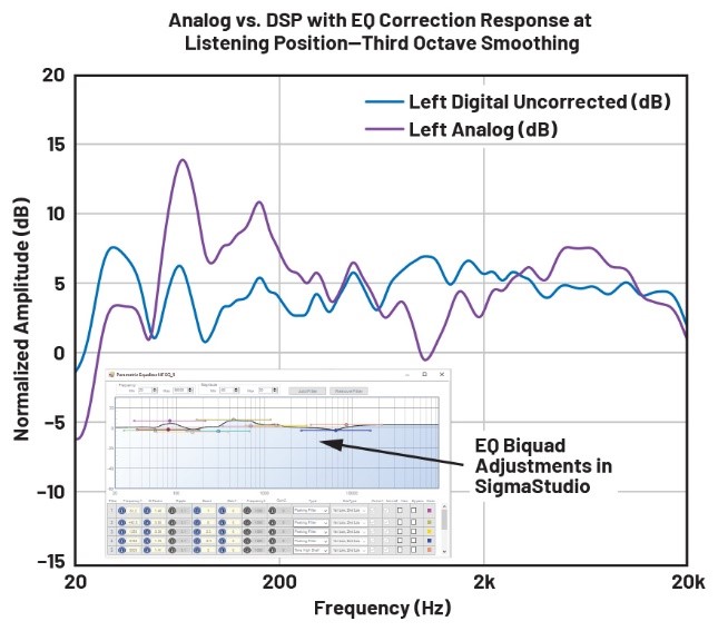 測試表明,模擬和數(shù)字分頻器具有相似的性能。然而根據(jù)觀察,ADAU1467 DSP在實(shí)現(xiàn)更高階的濾波器的同時,信號路徑的響應(yīng)更平滑。這一結(jié)果與模擬分頻器優(yōu)于數(shù)字分頻器的傳統(tǒng)觀點(diǎn)相悖。