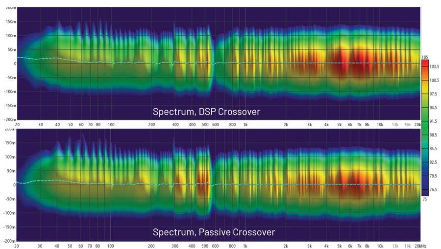 查看模擬和數(shù)字系統(tǒng)的頻譜圖(圖8)后發(fā)現(xiàn),數(shù)字系統(tǒng)中未出現(xiàn)額外的振鈴。這證實(shí)了DSP分頻器不會給播放帶來任何負(fù)時域效應(yīng)。事實(shí)上,模擬系統(tǒng)在300 Hz和500 Hz時具有額外諧振。在數(shù)字和模擬分頻器中,氣動高音揚(yáng)聲器(AMT Tweeter)在數(shù)字和模擬分頻器中的表現(xiàn)較為一致。