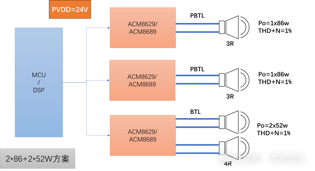 在party-speaker應用端,常見的有2.1方案和2.2方案。2.2方案中如果追求性能,推薦的做法是用3顆數(shù)字功放,方便做電子分頻。例如下圖方案,就是適合260W總功率以下的推薦方案。