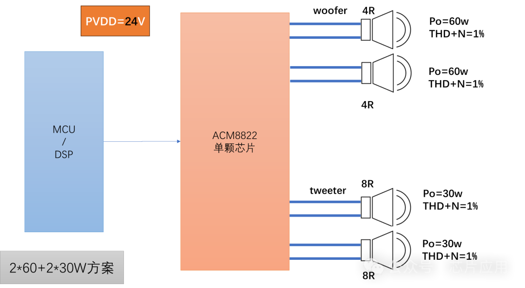ACM8822是4通道產(chǎn)品,內(nèi)部FET阻抗65毫歐,比8629更低,單通道輸出功率也大于8629;芯片4通道設計,并且內(nèi)部支持EQ分頻,對于2.2產(chǎn)品非常便捷。重點:ACM8822同樣支持動態(tài)升壓classH。