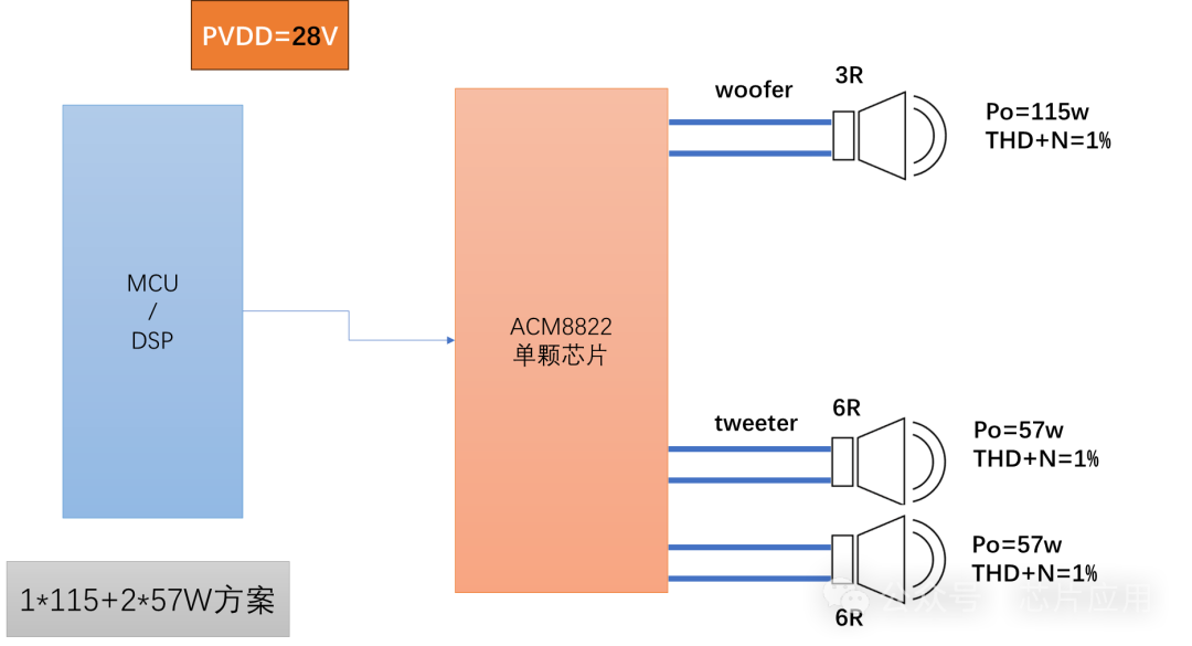 CM8822應用靈活,可以配置為2.1聲道,8822的特點是工作電壓寬,PVDD可以在4.5-30V電壓范圍。為了更好的動態(tài),可以將工作電壓設為28V,做1*115W+2*57W的組合應用。