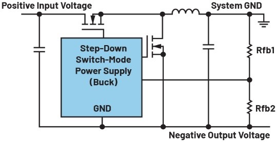 然而,有時電壓需要反相。在大多數(shù)情況下,需要將正電源電壓轉(zhuǎn)換為負電壓。這是為了給信號路徑中的傳感器供電,使其能夠處理具有正負電壓偏轉(zhuǎn)的信號。例如,+5V和-5V用作運算放大器的電源,以處理信號電壓。某些應(yīng)用需要負電壓來安全關(guān)斷MOSFET的柵極。要從現(xiàn)有正電壓產(chǎn)生負電壓,圖1所示的反相拓撲是合適的方案。其中,正電壓被轉(zhuǎn)換為負電壓。這種電路結(jié)構(gòu)簡單,不需要變壓器,可以利用標(biāo)準(zhǔn)降壓型開關(guān)穩(wěn)壓器IC構(gòu)建。降壓型穩(wěn)壓器的輸出電壓連接至系統(tǒng)接地端,GND引腳電壓產(chǎn)生負電壓,該負電壓可通過電阻分壓器Rfb1和Rfb2進行調(diào)節(jié)。