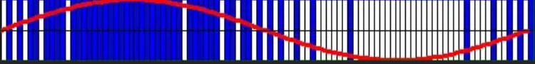脈沖密度調(diào)制(Pulse Density Modulation, PDM)就是將模擬信號(hào)的幅值用固定寬度脈沖的相對(duì)密度來(lái)表示。具體來(lái)說(shuō)就是高于平均幅值的模擬信號(hào)用正脈沖表示,對(duì)應(yīng)二進(jìn)制1;低于平均幅值的模擬信號(hào)用負(fù)脈沖表示,對(duì)應(yīng)二進(jìn)制0。模擬信號(hào)的幅值越大,對(duì)應(yīng)數(shù)字信號(hào)1的密度就越大;反之,模擬信號(hào)的幅值越小,對(duì)應(yīng)數(shù)字信號(hào)0的密度就越大。中間幅值則用1和0連續(xù)轉(zhuǎn)換來(lái)表示。下圖是紅色模擬信號(hào)與藍(lán)色PDM信號(hào)對(duì)比圖,其中1用藍(lán)色表示,0用白色表示。