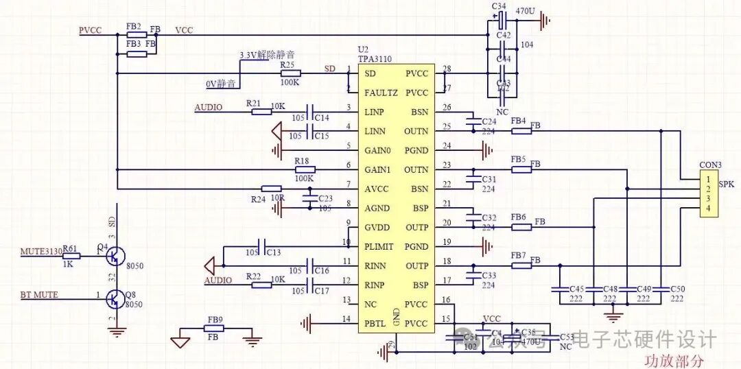 3. 右聲道輸出:21腳OUTP(右聲道正輸出)和18腳OUTP(右聲道負(fù)輸出)為右聲道BTL輸出端,經(jīng)C32(224)、C33(224)濾波+FB6/FB7磁珠抗干擾后,接入CON3的另一組引腳。