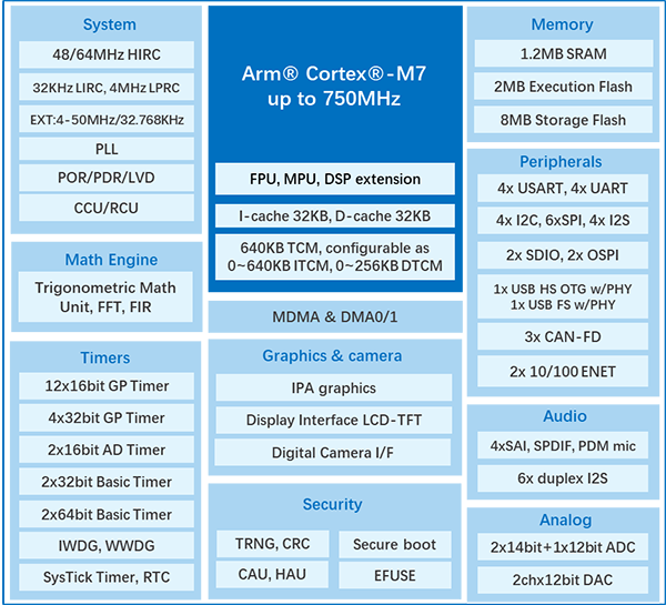 GD32H78E/77E、GD32H789/779系列MCU均基于性能強(qiáng)悍的Cortex®-M7內(nèi)核,主頻高達(dá)750MHz。該系列芯片擁有超高存儲(chǔ)配置,最高可支持2MB Execution Flash與8MB Storage Flash,并搭載1.2MB的SRAM,更特別配備高達(dá)640KB大容量緊耦合內(nèi)存(TCM),實(shí)現(xiàn)CPU同頻運(yùn)行,指令與數(shù)據(jù)的零等待執(zhí)行。無論是高實(shí)時(shí)任務(wù)、復(fù)雜算法還是密集型數(shù)據(jù)處理,這一革新架構(gòu)可讓算力持續(xù)釋放,系統(tǒng)響應(yīng)更快、執(zhí)行更穩(wěn)。