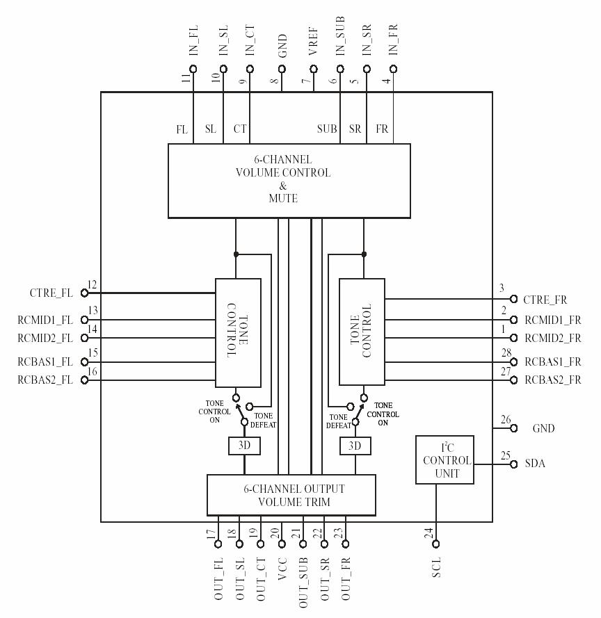 產(chǎn)品功能: 六聲道獨立輸入音質(zhì)處理器,IIC控制,3波段音質(zhì)控制(低音,中音,高音)