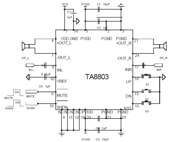 TA8803也具有很低的噪聲底板,大約在-100dB左右。TA8803還具有短路保護和過溫保護,其正常工作范圍為-40度到+85度攝氏。TA8803采用了SSOP-24無鉛封裝。