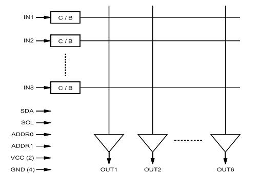 AX6502提供8個可任意連接到6個輸出的輸入端口,每個輸入都可以連接到1個或多個輸出,但是每個輸出只能連接一個輸入。AX6502的輸入提供鉗位或偏置選項,以便處理同步或非同步的視頻信號,鉗位可將輸出同步端電平設(shè)置為300 mV。而偏置選項則可在內(nèi)部將輸入偏置為1.25 V的非同步信號。所有的輸出用來驅(qū)動一個150 Ω的直流負(fù)載。每個輸出可以提供0dB6dB的信號增益。輸入到輸出線路和輸入偏置模式功能受I2C兼容數(shù)字接口控制。采用TSSOP-24封裝,管教功能完全兼容FMS6502/SGM6502。