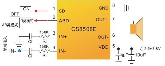CS8508E的全差分架構(gòu)和極高的PSRR有效地提高了對RF噪聲的抑制能力,并且省去了傳統(tǒng)音頻功放的BYPASS電容。