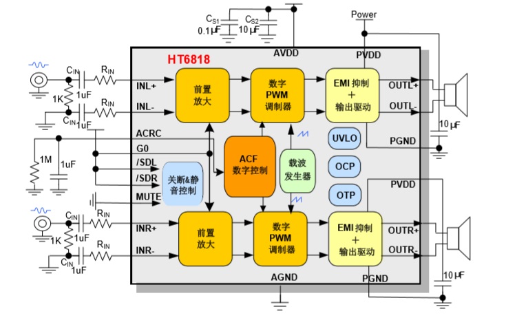 此外,HT6818內置的關斷功能使待機電流最小化,還集成了靜音功能、左右聲道獨立關斷、揚聲器輸出端過流保護、片內過溫保護和欠壓異常保護等功能;采用無鉛QFN-20/TSSOP-20SOP-16封裝形式。
