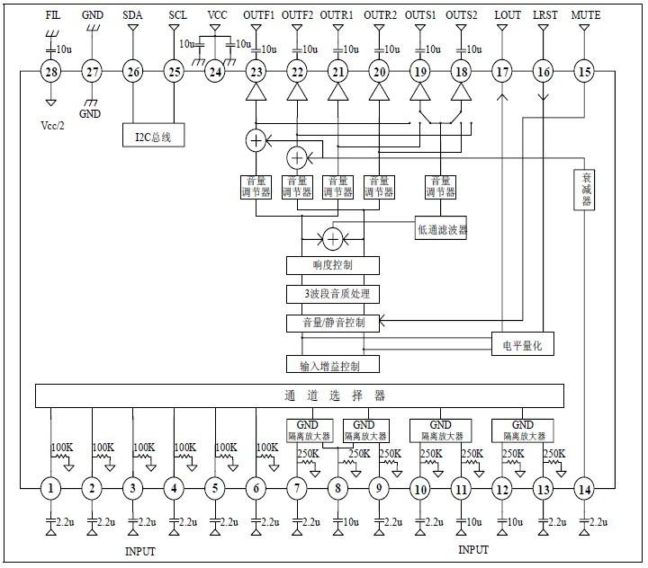 全集成低音,中音,高音,響度濾波器,無(wú)需外圍元件;為重低音通道設(shè)置低通濾波器并且GV、Q、fc 受控于I2C 總線,數(shù)據(jù)控制簡(jiǎn)單;