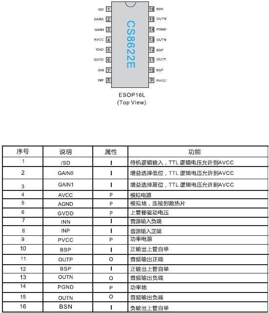 當前位置:首頁->產品展示->功放IC->CS8622(適用于鉛酸電池拉桿音箱25W單聲道D類音頻功放IC)