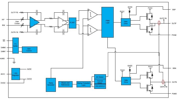 HT366 2×22W(VDD=14V, RL=4Ω, THD+N=10%)或34W (VDD=16V, RL=4Ω, THD+N=10%) TSSOP-28 4.5V-16V 具有防破音功能的免電感濾波2×20W D類立體聲音頻功放 TPA3110/AD52068/CS3817