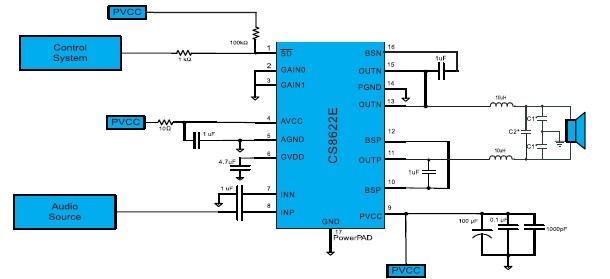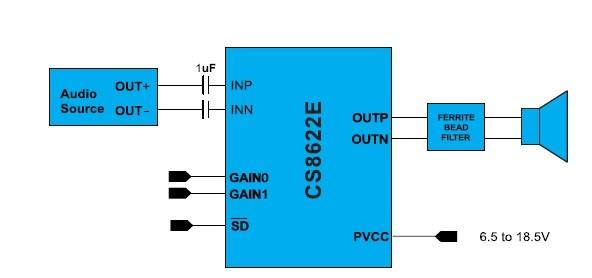 CS8622E內置了過流保護,短路保護和過熱保護,有效的保護芯片在異常的工作條件下不被損壞。CS8622E可以驅動低至4Ω負載的揚聲器,最高可提供25W的連續(xù)功率,具有高達90%的效率,使得在播放音樂的時候不需要額外的散熱器。