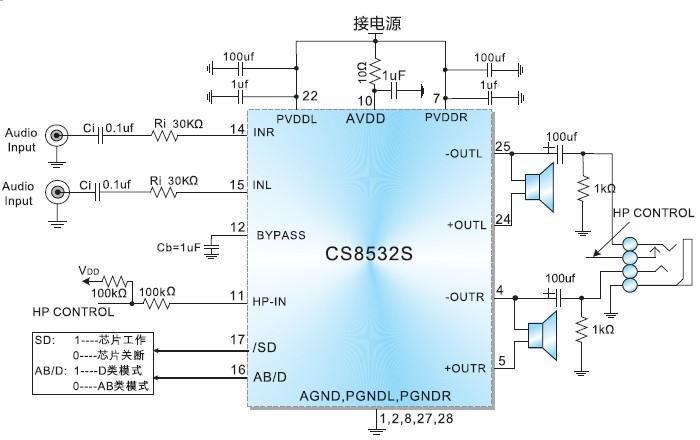 CS8532S是一款帶AB/D切換,全橋音頻功率放大器芯片。采用8.4V的電源供電,在THD+N等于10%情況下,能為4歐的負(fù)載提供9.0W的連續(xù)功率。此外,當(dāng)接立體聲耳機(jī)時(shí),芯片可以單端工作模式驅(qū)動(dòng)立體聲耳機(jī)。