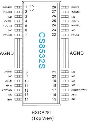 CS8532S提供了HSOP28L封裝形式,其額定的工作溫度范圍為-40℃至85℃。