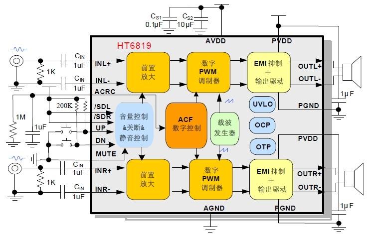 此外,HT6819內(nèi)置的關(guān)斷功能使待機電流最小化,還集成了靜音功能、左右聲道獨立關(guān)斷、揚聲器輸出端過流保護、片內(nèi)過溫保護和欠壓異常保護等功能;采用無鉛TSSOP-20封裝形式。