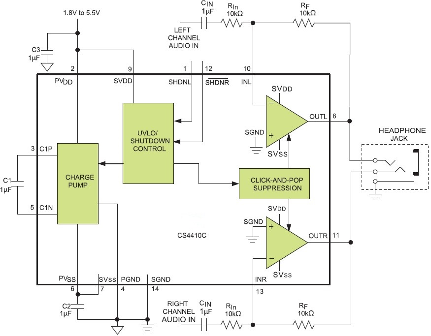 CS4410每個通道可向16Ω負(fù)載輸出130mW,THD+N僅為0.006%。217Hz時具有86db的高電源抑制比(PSRR),允許該器件工作在嘈雜的數(shù)字電源,無需額外的線性穩(wěn)壓器件。精巧的咔嗒聲抑制電路消除了啟動與關(guān)斷過程中的可聞噪聲。精巧的咔嗒/噼噗聲抑制電路消除了啟動與關(guān)斷時的咔嗒聲和噼噗聲。獨立的左/右低功率關(guān)斷控制可以在混合模式、單聲/立體聲應(yīng)用中盡可能地節(jié)省能源。