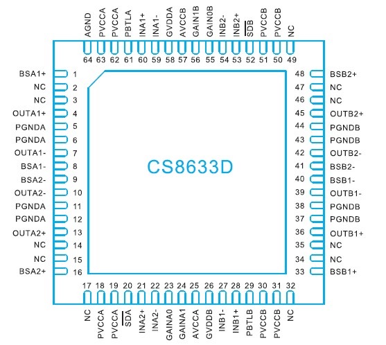 CS8633D 提供纖小的QFN8X8_64L封裝形式供客戶選擇,可以為客戶節(jié)省客觀的PCB面積,其額定的工作溫度范圍為-40℃至85℃。