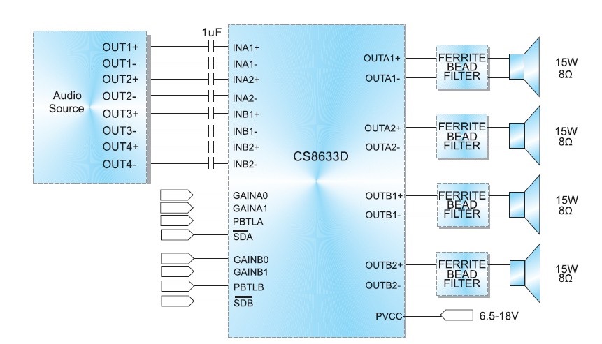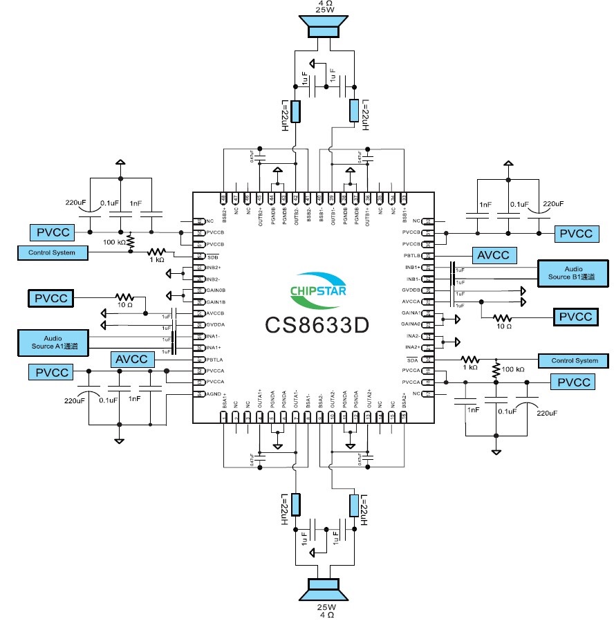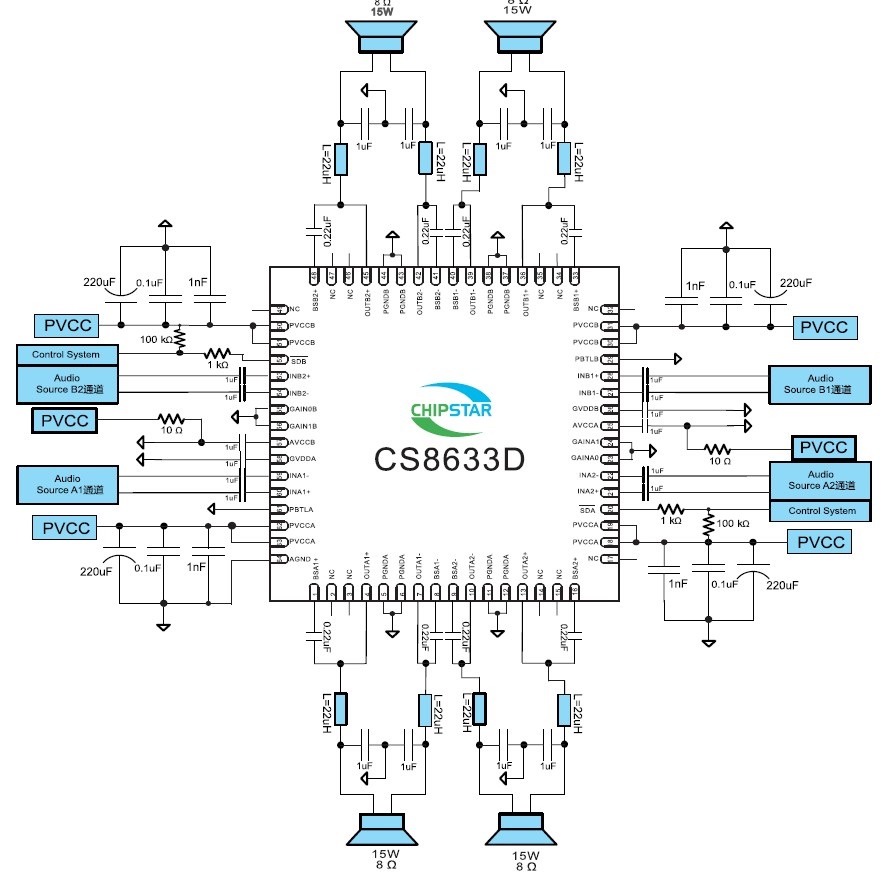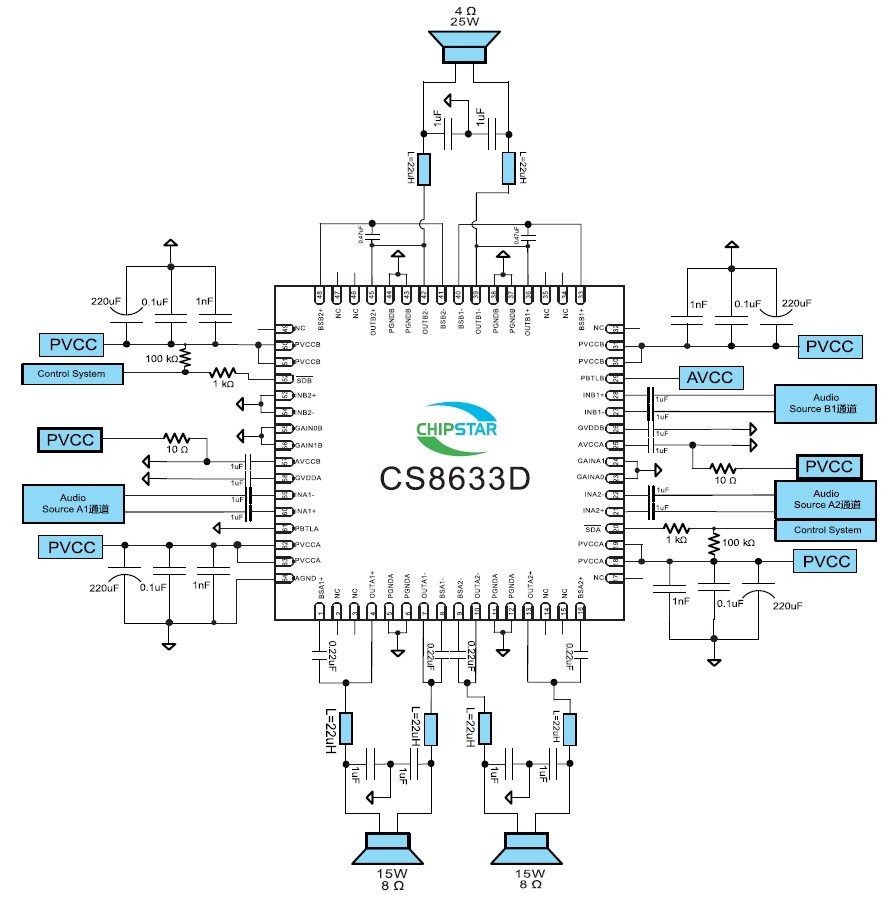 CS8633D 內(nèi)置了過流保護(hù),短路保護(hù)和過熱保護(hù),有效的保護(hù)芯片在異常的工作條件下不被破壞。CS8633D 利用芯片自帶的PBTL功能可以方便的應(yīng)用在2.0,2.1或者4.0等音響系統(tǒng)上,可以為兩路4歐負(fù)載提供2X25W的連續(xù)功率,也可以為四路8歐負(fù)載提供4X15W的連續(xù)功率,特別針對(duì)2.1的音響系統(tǒng)可以提供1路4歐負(fù)載驅(qū)動(dòng),兩路8歐的負(fù)載驅(qū)動(dòng),為整個(gè)音頻系統(tǒng)提供25W+2X15W的整體輸出功率。CS8633D 具備90%的效率,使得在播放音樂的時(shí)候不需要額外的散熱設(shè)計(jì)。