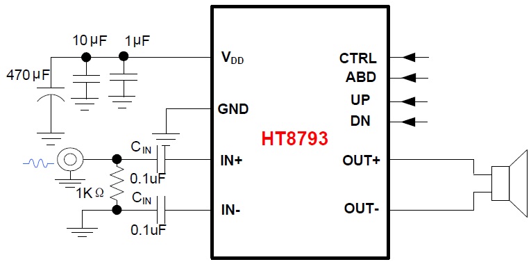 此外,HT8793內(nèi)置的關(guān)斷功能使待機電流最小化,還集成了輸出端過流保護、片內(nèi)過溫保護和電源欠壓異常保護等功能。