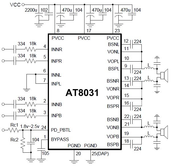 恒定4.8W/2.5V-5.5V(內(nèi)置自適應(yīng)Charge Pump模塊)/4Ω |