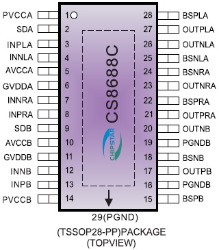 CS8688C提供纖小的TSSOP28-PP封裝形式供客戶選擇,可以為客戶節(jié)省可觀的PCB面積,其額定的工作溫度范圍為-40℃至85℃。