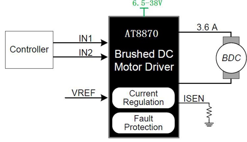 AT8870集成電流限制功能,該功能基于模擬輸入VREF 以及ISEN 引腳的電壓。該器件能夠將電流限制在某一已知水平,這可顯著降低系統(tǒng)功耗要求,并且無需大容量電容來維持穩(wěn)定電壓,尤其是在電機啟動和停轉時。