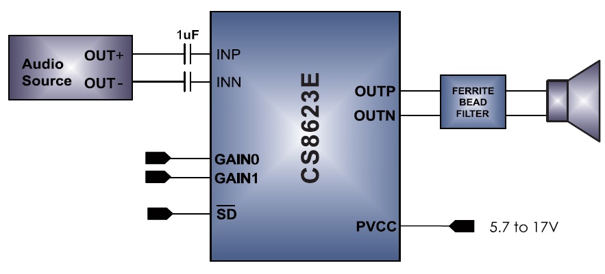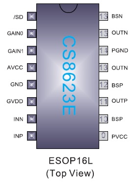 使得在播放音樂的時候不需要額外的散熱器。CS8623E提供纖小的ESOP16封裝形式供客戶選擇,可以為客戶節(jié)省可觀的PCB面積,其額定的工作溫度范圍為-40℃至85℃。