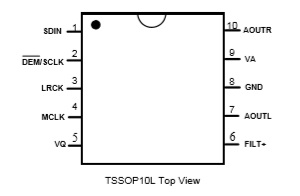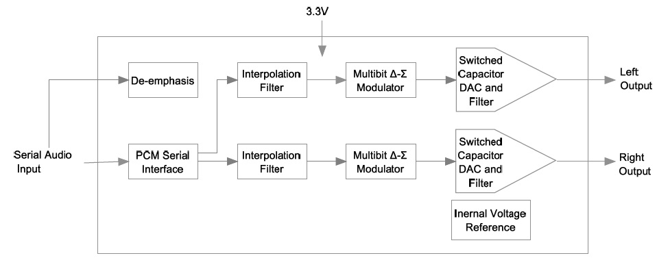 該系列產品基于一個多比特位的Δ-Σ調制器,將數(shù)字信號轉化成兩個聲道的模擬信號并經過模擬濾波器濾波。該Δ-Σ調制器對時鐘抖動的敏感度很低,且在帶寬范圍外具有極低的噪聲。其還可使用采樣率和主時鐘比作為自采樣率(2kHz – 200kHz),從而實現(xiàn)自動檢測采樣頻率的功能。