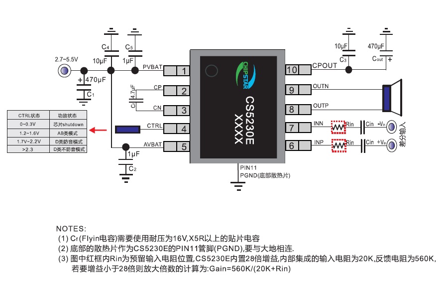 CS5230E是一款采用CMOS工藝,電容式升壓型GF類單聲道音頻功放,可以為4Ω的負載提供最高5W的連續(xù)功率;CS5230E芯片內(nèi)部固定的28倍增益,有效的減少了外圍元器件的 數(shù)量;功放集成了D類和AB類兩種工作模式即可保證D類模式下強勁的功率輸出,又可兼顧系統(tǒng)在有FM的情況下,消除功放對系統(tǒng)的干擾;CS5230E具有獨特的防破音(NCN)功 能,可根據(jù)輸出信號的大小自動調(diào)整功放的增益,實現(xiàn)更加舒適的聽覺感受,CS5230E還具備電源自適應(yīng)能力,當(dāng)電源電壓低的時候,功放會自動降低增益,從而減少功放的輸出功率. CS5230E的外圍只有低成本的阻容器件,在以鋰電池供電的移動式音頻設(shè)備中,CS5230E是理想的音頻子系統(tǒng)的功放解決方案.CS5230E的全差分架構(gòu)和極高的PSRR有 效地提高了CS5230E對RF噪聲的抑制 能力。另外CS5230E內(nèi)置了過流保護,短路保護和過熱保護,有效的保護芯片在異常的工作條件下不被損壞。