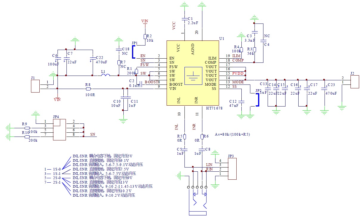 HT71678帶有音頻信號檢測功能,可根據(jù)信號幅度自適應(yīng)調(diào)整升壓輸出值,以達(dá)到更高的系統(tǒng)整體效率。其支持10種不同的模式選擇。