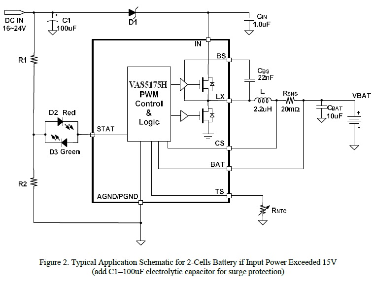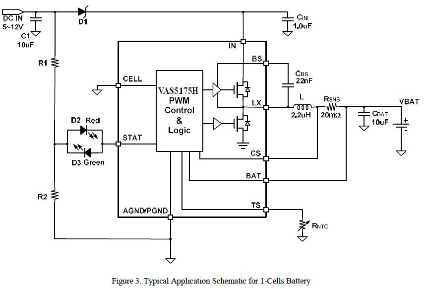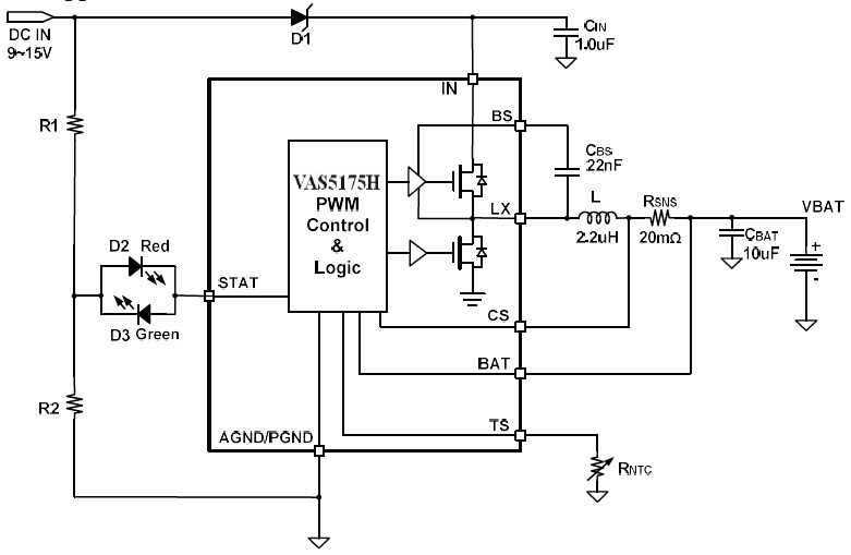 VAS5175H 是一款5V-24V 輸入,開關(guān)降壓型1節(jié)4.35V/2節(jié)8.7V鋰離子/聚合物電池充電芯片, 以高精度調(diào)節(jié)2A 充電電流,和電池電壓。它密切監(jiān)測(cè)電池組的溫度只在設(shè)置安全溫度范圍下允許充電,還提供電池檢測(cè)、預(yù)充電調(diào)節(jié)、充電飽充和充電狀態(tài)指示等功能。 |