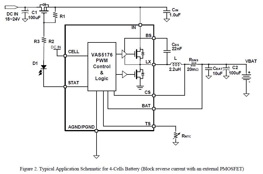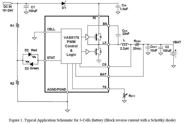 產(chǎn)品功能: VAS5176 是一款8.5V-24V 輸入,高度集成的開關(guān)型鋰離子/聚合物電池充電管理芯片, 以高精度調(diào)節(jié)2A充電電流,和電池電壓。