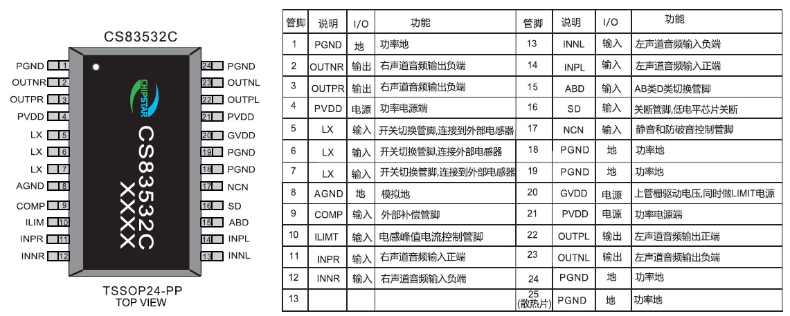 CS83532 2XW/2.7V-5.5V/4Ω TSSOP-24 2.5V-5.5V 三種防破音模式,AB/D切換,靜音控制,內(nèi)置壓模塊,恒定2 x 8W輸出功率