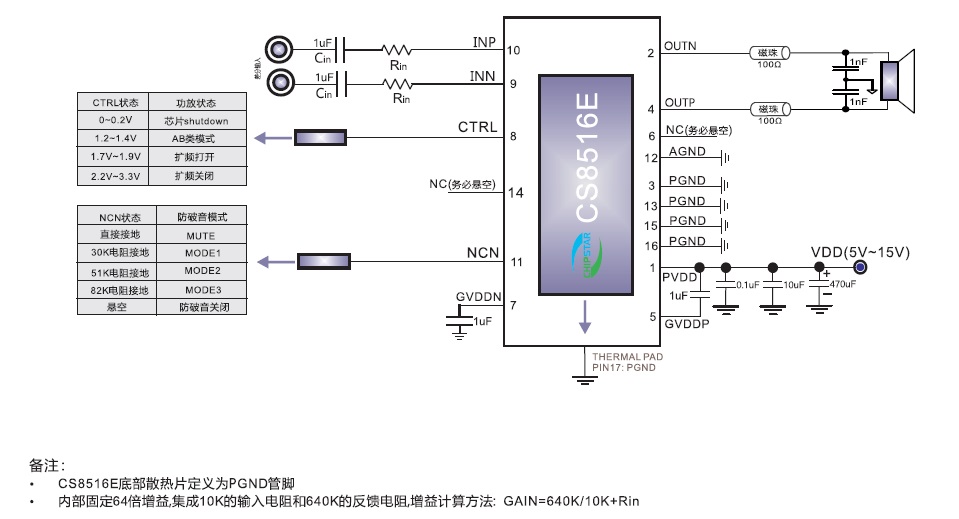 CS8516E的全差分架構(gòu)和極高的PSRR有效地提高對(duì)RF噪聲的抑制能力。無(wú)需濾波器的PWM調(diào)制結(jié)構(gòu)及內(nèi)置的BOOST升壓模塊,以及CS8516E采用專有的AERC((Adaptive Edge Rate Control)技術(shù),在音頻全帶寬范圍內(nèi)極大地降低了EMI的干擾, 對(duì)60cm的音頻線,在FCC的標(biāo)準(zhǔn)下具有超過(guò)20dB的裕量,另外CS8516E內(nèi)置了過(guò)流保護(hù),短路保護(hù)和過(guò)熱 保護(hù),有效的保護(hù)芯片在異常的工作條件下不被損壞