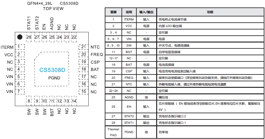 CS5308D具有完善的保護(hù)功能,包括輸入欠壓和過壓保護(hù)、電池過壓和短路保護(hù)、電池溫度保護(hù)、芯片溫度調(diào)節(jié)和保護(hù)。此外芯片通過外接的兩路LED指示燈,可對充電過程實(shí)現(xiàn)全程監(jiān)控。采用QFN4X4_28L封裝。
