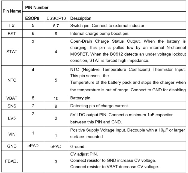 BC912 BC911是一款4V-18V寬電壓輸入,支持單節(jié)鋰電池或磷酸鐵鋰電池的降壓充電管理IC。集成功率MOS,采用同步開關(guān)架構(gòu),使其在應(yīng)用時(shí)僅需極少的外圍器件, 可有效減少整體方案尺寸,降低BOM成本。BC912具有3A的充電電流能力,充電電流可以通過外部電阻靈活可調(diào), 充電效率可以達(dá)到95%以上;恒壓充電電壓可調(diào)(電壓點(diǎn)7.2V-9.4V可調(diào),僅限于DFN-10封裝),實(shí)現(xiàn)對(duì)多類型如二節(jié)鋰電池(8.4V/8.7V/8.8V)、二節(jié)磷酸鐵鋰電池(7.2V)的充電管理。 ESOP-8/DFN-10 4V-18V 8.4V/8.7V/8.8V充滿截止電壓可調(diào)、3A雙節(jié)鋰電充電管理IC BC911/BC913