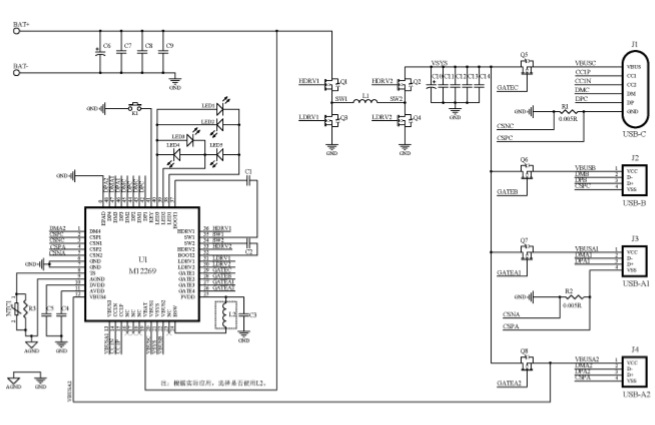 M12269是一款面向3-8串電芯大功率移動電源應(yīng)用的專用SOC,集成了同步升降壓電壓變換器、電池充放電管理模塊、顯示模塊、電量計(jì)算模塊,提供最大140W輸入/輸出功率,支持 PD3.1、QC3.0、AFC、FCP、 SCP、BC1.2 DCP 等主流快充協(xié)議,并提供過壓/欠壓、過充/過放、過溫等完備的保護(hù)功能。配合簡單的外圍電路,即可組成大功率多口移動電源管理方案。當(dāng)2個或3個USB接口同時放電時,關(guān)閉快充,輸出固定為5V。