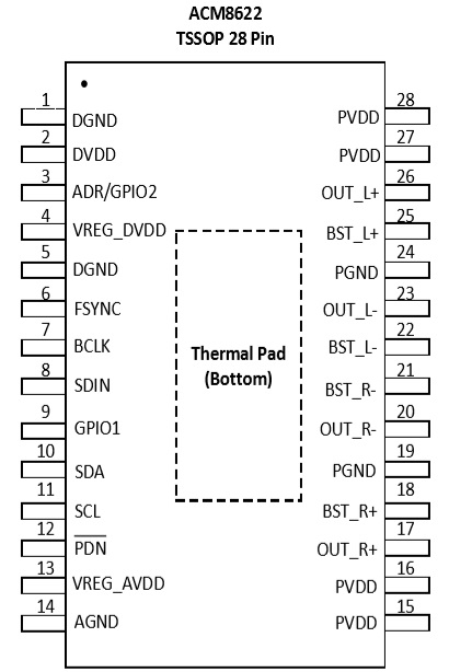 ACM8623 2×14W, 立體聲輸出(4Ω, 12V, THD+N = 1%); 2×10.5W, 立體聲輸出 (6Ω, 12V, THD+N = 1%) TSSOP-28 4.5V-15.5V I2S輸入15W雙聲道數(shù)字功放IC ACM8622/ACM8625M/ACM8625P/ACM8625S/ ACM8685/ACM8628/TAS5805/AD82128