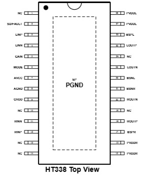 HT338 2×50W (VDD=24V, RL=6Ω, THD+N=10%); 80W (VDD=24V, RL=4Ω, THD+N=10%) TSSOP-28 4.5V-26V 2×50W立體聲D類音頻功放IC AD52090/CS3850/TPA3110