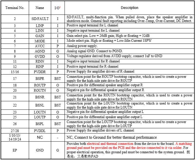 產(chǎn)品功能: 2×50W (VDD=24V, RL=6Ω, THD+N=10%); 80W (VDD=24V, RL=4Ω, THD+N=10%)