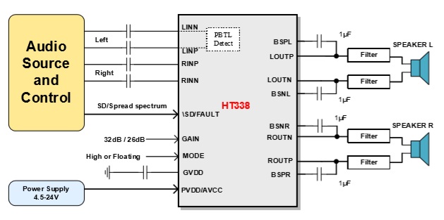 產(chǎn)品名稱: HT338(50W雙聲道/100W單聲道D類音頻功放IC)